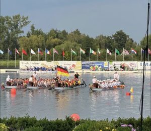 In einem Drachenboot haben 20 Paddler Platz, ein Trommler und ein Steuermann. Ziel ist es, gleichmäßig zu paddeln und je mehr sich jeder anstrengt, um so schneller ist das Boot.