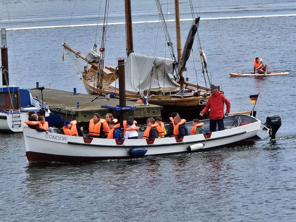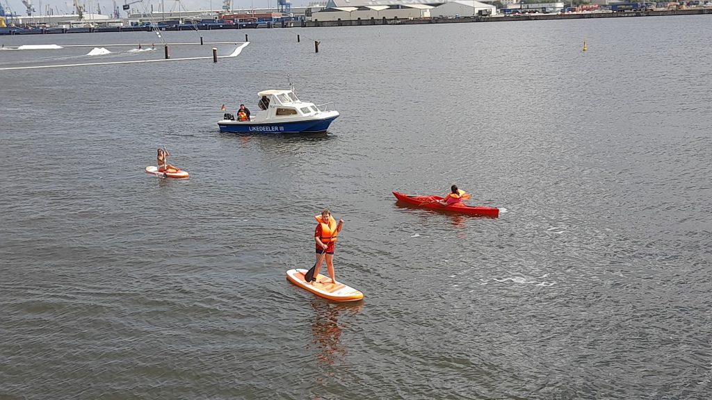 An Mittwoch (30. Juli) und Donnerstag (31. Juli) wurden die Kinder in zwei Gruppen aufgeteilt. Zunächst stand für alle eine spannende Schiffsrundführung auf der „Likedeeler“ an, bei der die Kinder das gesamte Schiff kennenlernen konnten. Anschließend durften sich die Gruppen abwechselnd bei verschiedenen Wasseraktivitäten ausprobieren: Kanu fahren, Stand-up-Paddeln und eine Fahrt mit dem Kutter, einem alten Rettungsboot. Besonders aufregend war, dass jeder einmal selbst Steuermann oder Steuerfrau auf dem Kutter sein durfte. Eine Gruppe nutzte außerdem noch einmal die Gelegenheit für einen letzten Stadtbummel durch Rostock.